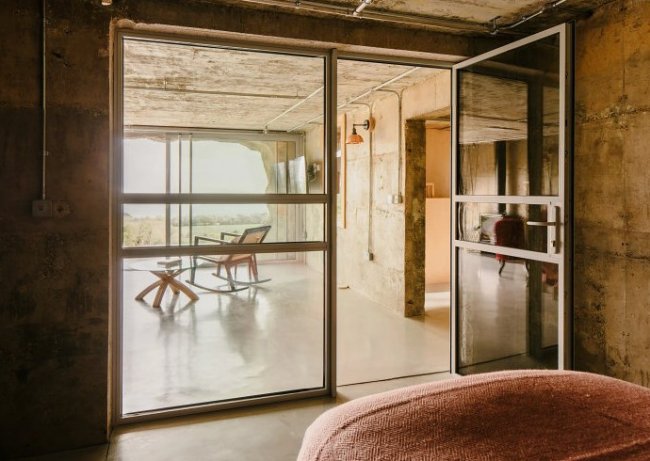 Аскетичный, брутальный дизайн внутреннего интерьера дополняют оставшиеся практически в первоначальном виде бетонные стены. Работая над проемом, авторы проекта попытались воспроизвести пролом, образовавшийся в результате взрыва немецкой авиабомбы, который удивительным образом гармонирует с просторными раздвижными окнами.