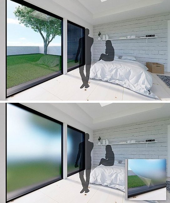 Можно будет, к примеру, приглушить свет, как с помощью жалюзей, или настроить окна соответственно вашим чувствам, добавив теплоты или, наоборот, холода. Для приватной обстановки наверняка подошёл бы молочный цвет, пропускающий 90 % естественного света.
