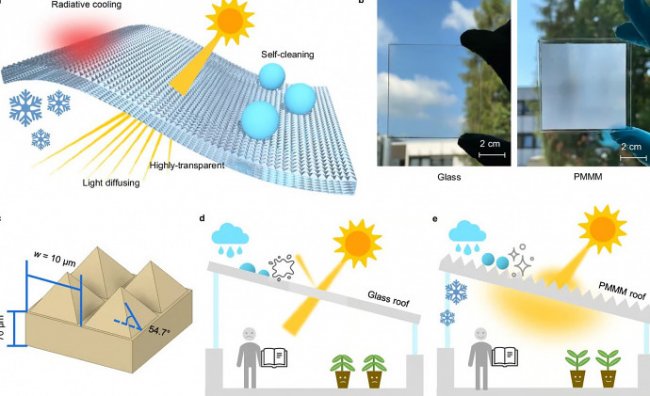 Инженеры из Технологического института Карлсруэ в Германии разработали новое покрытие для стекла или его аналогов, которые используются в жилых помещениях и теплицах. Оно представляет собой тонкую пленку, внешняя сторона которой покрыта крошечными пирамидками около 10 микрон в поперечнике. Разработка получила название «микрофотонный многофункциональный метаматериал на полимерной основе» (Polymer-based Micro-photonic Multi-functional Metamaterial).