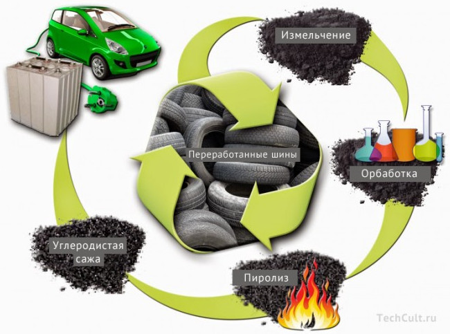 Этот технологический процесс был разработан командой ученых из Oak Ridge. Метод заключается в восстановлении пиролитического углерода при разложения органики во время нагревания резины при отсутствии кислорода.
