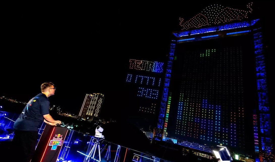 В минувшее воскресенье в Дубае прошли соревнования Red Bull Gaming по игре в классический Тетрис. Особенностью этого мероприятия стал гигантский игровой экран, сформированный из 2800 квадрокоптеров. Они использовали динамическую подсветку и синхронизацию работы, что имитировать движение пикселей на настоящем экране.
