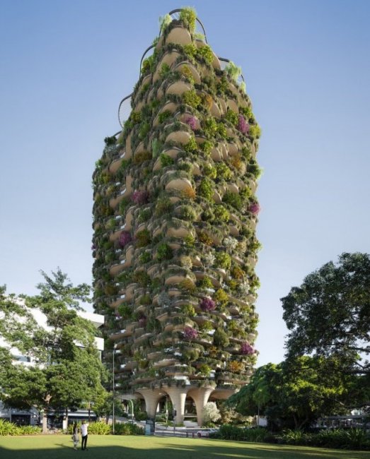 В Брисбене (Австралия) разработан проект здания, на котором будет больше деревьев, чем в соседнем городском парке. Это проект Urban Forest – 30-этажный высотный дом с 382 квартирами, на фасаде, крыше и террасах которого будут высажены более 1000 деревьев и 20000 растений.