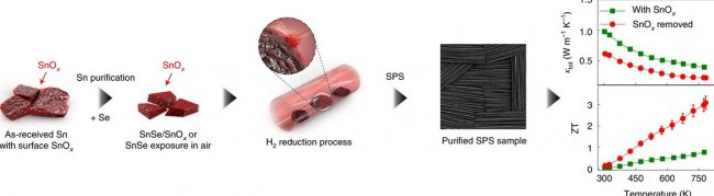 Однако при работе с поликристаллическом селенидом обнаружилась его высокая теплопроводность. Ее причиной оказался тонкий слой оксида олова, образующийся на поверхности материала. Использовав для получения соединения высокоочищенные исходные вещества и удалив оксидный слой, исследователи добились ZT 3,1.