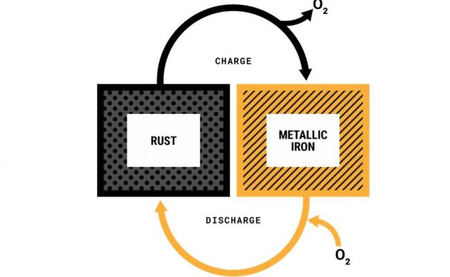 В железо-воздушных батареях протекает обратимый процесс окисления металла, то есть ржавление. Железо, соединяясь с находящимся в воздухе кислородом, превращается в ржавчину с выделением энергии. Во время зарядки, когда в аккумулятор поступает электроэнергия, образованные окислы восстанавливаются до металлического железа, возвращая кислород.