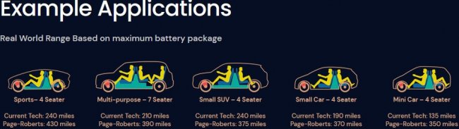 Page-Roberts отмечает, что вертикальная установка аккумулятора лучше всего подходит для небольших четырехместных машин. Компания подчеркивает, что ее разработка позволит дизайнерам наделить спорткары с низкой посадкой пропорциями, классическими для автомобилей класса Gran Turismo.