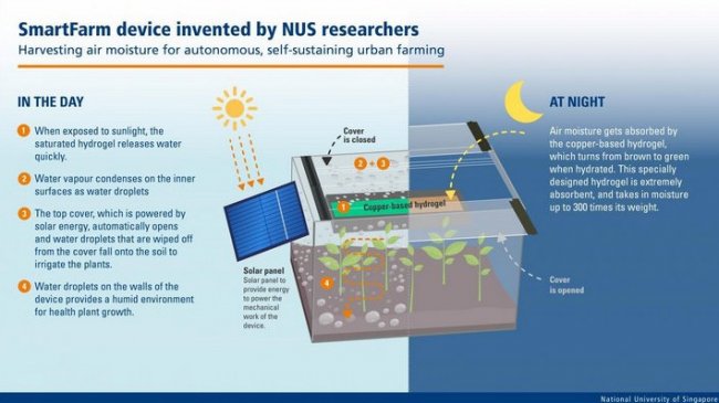 Команда ученых из Национального университета Сингапура под руководством доцента Тан Суи Чинг разработала прототип парника, пригодного для выращивания культур в местностях с недостаточным количеством осадков. Это возможно потому, что SmartFarm улавливает влагу для полива из воздуха.