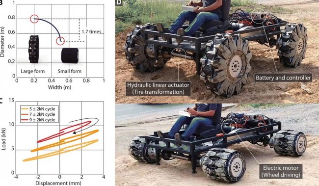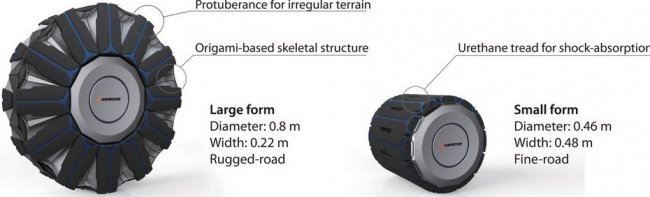 Отдел исследований и разработок корейского производителя шин Hankook совместно с экспертами Сеульского университета и инженерами из Гарварда представили уникальное колесо, которое может складываться подобно оригами. Это позволяет кардинально изменять ширину и диаметр движителя, в том числе под нагрузкой.