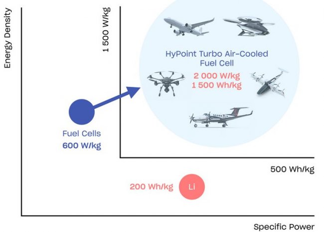 Один из проектов HyPoint предполагает создание летательного аппарата, способного взлетать и приземляться вертикально, силовая установка которого с учетом емкостей для водорода будет весить 590 кг и сможет выдавать мощность 600 л. с. (450 кВт), обеспечивая почти два часа полета без дозаправки.