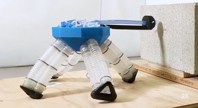 Это обеспечивает сгибание ног, каждая из которых имеет три степени движения, и, с чередованием нагнетания в них воздуха, позволяет роботу перемещаться по ровной поверхности. Команда разработала специальные пневматические схемы управления для создания походки, которая была вдохновлена движениями черепахи, а также встроила простейшие датчики в виде крошечных шариков с воздухом: при наезде на препятствие, шарик вдавливается, перекрывает клапан и отправляет робота в обратном направлении.