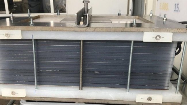 Наиболее инновационный компонент системы — элемент питания батареи, в котором происходит электрохимическая реакция. Он состоит из множества одинаковых ячеек. Они собраны из графитового полотна, мембран и разработанных Fraunhofer UMSICHT новых биполярных пластин, изготовленных из графита и пластика.