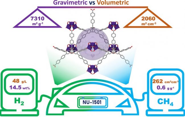 Команда исследователей из Северо-Западного университета смоделировала и получила вещества с высокой пористостью и большой площадью поверхности. Их можно использовать для хранения водорода и метана, на которых работают автомобильные топливные элементы. Эти газы вполне способны заменить ископаемое топливо, при сжигании которого выделяется двуокись углерода.
