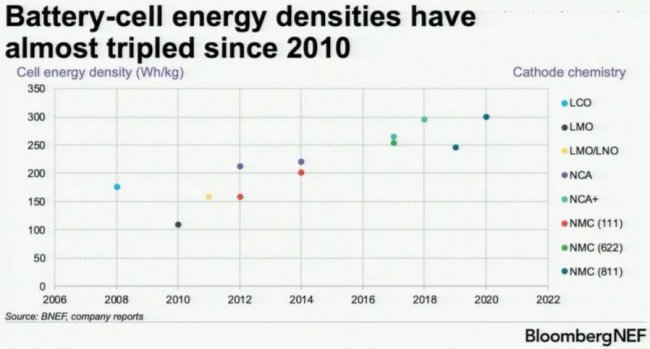 «Плотность энергии батарей продолжает улучшаться, - сказал Маккерчер, глава департамента перспективных транспортных средств BloombergNEF. - На уровне ячеек она практически утроилась с 2010 года».