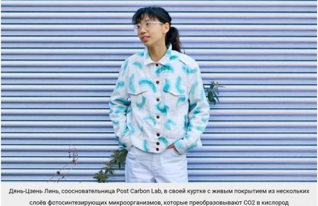 Дянь-Цзень Линь, соосновательница Post Carbon Lab, в своей куртке с живым покрытием, состоящим из нескольких слоёв фотосинтезирующих микроорганизмов, которые преобразовывают углекислый газ в кислород.
