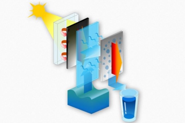 Многослойная система испарения и конденсации похожа на систему дистилляции спирта. Плоские панели абсорбируют тепло и переносят его в слой воды, которая при нагревании начинает испаряться. Затем эта вода конденсируется на следующей панели, куда передается и накопленное тепло.