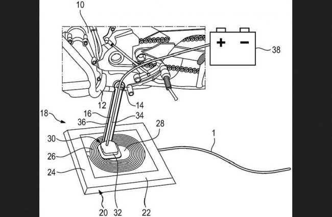 Инженеры BMW предлагают запустить процесс зарядки мотоцикла с того момента, как он поставлен на парковочное место. Для автомобилей такая задача тоже актуальна, но для нее пока не придумали действенного решения. Если же посмотреть на патентный чертеж BMW, становится понятно, что беспроводная зарядка осуществляется посредством единственного нерезинового элемента конструкции мотоцикла, который контактирует с землей, - за счет боковой подножки.