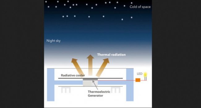 Верхняя часть устройства остывает быстрее, чем нижняя, а возникающая разность температур преобразуется в электричество с помощью термоэлектрического модуля. Хотя прототип обеспечивает достаточную для работы светодиода энергию, он продемонстрировал на три порядка меньшую эффективность на квадратный метр по сравнению с традиционной солнечной батареей.