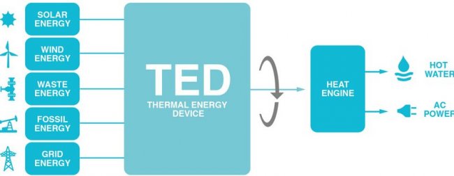 ССТ создала «Установку термической энергии» (Thermal Energy Device, TED), представляющую собой модульный блок для хранения мощностей, вырабатываемых любыми ВИЭ – солнечной, ветровой, углеводородной или полученной напрямую из энергосети. Принимая эту энергию, он использует ее для нагрева и плавки кремния в полностью герметичной камере. Когда электричество снова потребуется, оно будет получено с помощью теплового двигателя. Стандартный TED-бокс удерживает 1.2 МВт*ч энергии и при этом умещается в шестиметровый контейнер.