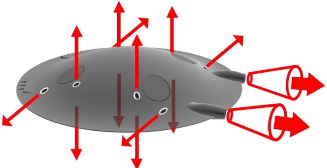 В верхней части аппарата есть два сопла по бокам, которые выполняют такую же функцию, как камеры РЖД малой тяги в космических кораблях. В горизонтальном полете они помогают ADIFO быстро поворачивать и менять направление и придают аппарату уникальную подвижность и поворотливость без крыльев, элеронов, руля и закрылков. Он может летать даже в перевернутом положении и развивает дозвуковую и сверхзвуковую скорость без звукового удара.