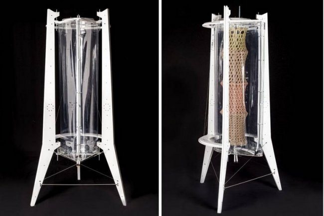 Когда кто-то говорит о стройматериалах, в голове сразу же возникает ассоциация с традиционным кирпичом, деревом, землей или бамбуком. Но как насчет текстиля, обработанного с помощью микроорганизмов? Архитектор из Лондона Бастиан Бейер в сотрудничестве с немецким дизайнером Дэниелом Суаресом создал необычную колонну из трикотажных волокон. Жесткости конструкции придали бактерии Sporosarcina Pasteurii, образовавшие на ее поверхности прочный слой кальцита.