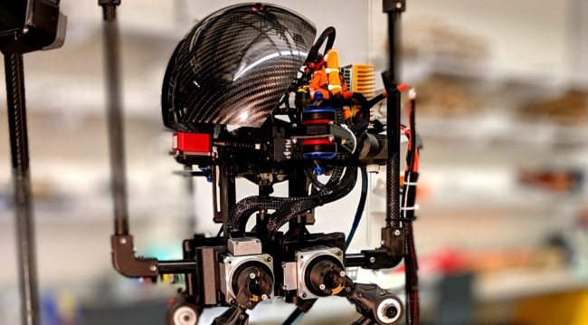 Этот малыш (всего 0,8 м в высоту и весом 2,7 кг) имеет небольшое тело на двух тонких ножках, что делает его похожим на «ходячего цыпленка». Чтобы сбалансировать прочность и массу материалом для изготовления послужило углеродное волокно. Создатели назвали робота LEONARDO (LEg ON Aerial Robotic DrOne), что является необычно длинной аббревиатурой. По бокам у него имеется два подруливающих двигателя, мощность которых позволяет «Лео» даже взлететь. Робот точно не составит конкуренцию в маневренности дрону, но такая цель и не преследовалась. Главная задача – продлить его пребывание в воздухе после прыжка через препятствие для плавной и мягкой посадки.