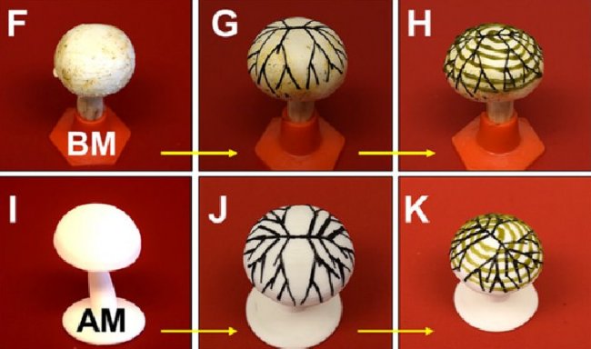 Исследователи создали два типа «чернил» для печати на грибе, в данном случае шампиньоне. Один из материалов основан на гидрогеле из альгината натрия, в который добавлена питательная среда для бактерий и сами бактерии рода Anabaena. Второй материал печати — это проводящая смесь из двух иономеров PEDOT:PSS, в которую добавили графеновые наноленты. Во время печати 3D-принтер сначала создает токосборник из графеновой смеси, а затем поверх него печатает спиралевидную полосу из смеси с цианобактериями.