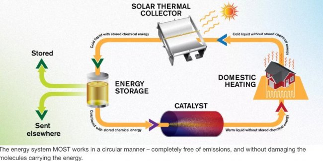 Этот недостаток в значительной мере тормозил развитие отрасли, но за последний год появился ряд научных работ, предлагающих решение проблемы. Авторами одной из них стали шведские ученые, которые создали жидкость, получившую название «гелиотермальное топливо». Они уверяют, что новое вещество способно удерживать солнечную энергию не один год, а хранить его можно будет в обычной бутылке.