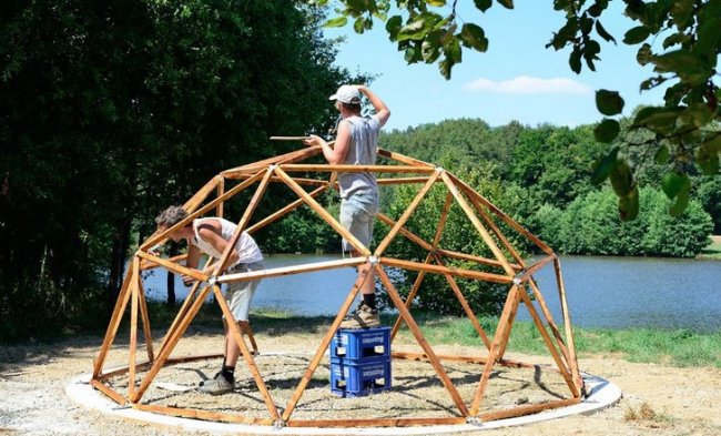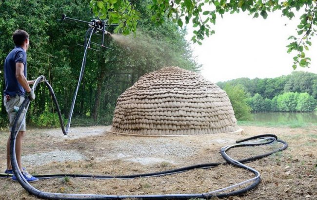 Идея состоит в том, чтобы мультикоптер с помощью распылительного шланга наносил слой глинистого биоматериала на легкий каркас, увешанный сотнями маленьких мешков с песком или опилками. Сам каркас выполняется в виде купола – подобная форма обусловлена способностью равномерно распределить вес мешков и грязевого покрытия на всю поверхность. Кроме того, такая конструкция здания обладает наибольшей энергоэффективностью.