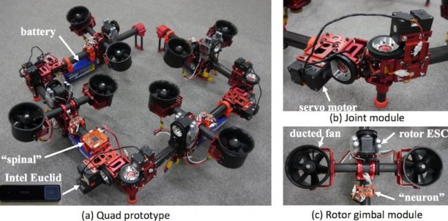 Опытный образец DRAGON состоит из четырех модулей, к каждому из которых присоединена пара сдвоенных винтов. Цилиндрические шарниры с аккумуляторами соединяют модули вместе, а глазами и мозгом «дракона» служит блок управления Intel Euclid, благодаря которому робот распознает особенности окружающего пространства и без участия человека определяет, какую форму лучше принять в полете, чтобы преодолеть препятствия.