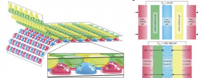 С целью воспроизводства этого эффекта исследователи из Фрибурского, Мичиганского и Калифорнийского (в Сан-Диего) университетов обратили внимание на разницу в солености пресной и морской воды. Они разместили гидрогель, ионопроводящие капли, на прозрачные пластиковые листы и разделили их ионоселективными мембранами.