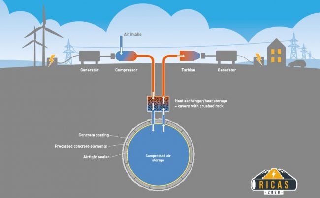 Чтобы решить эту проблему, учёные при финансовой поддержке Евросоюза в рамках проекта RICAS 2020 разрабатывают улучшенное адиабатическое хранилище AA-CAES, использование которого позволит сохранять и использовать тепло, получаемое от сжатия воздуха. Ключевым компонентом проекта является секция, позволяющая накапливать тепло. Выходящий из компрессора воздух проходит через своеобразный фильтр из дроблёного камня. Через него же воздух проходит и в процессе выкачивания из хранилища, что снимает необходимость в подогреве.