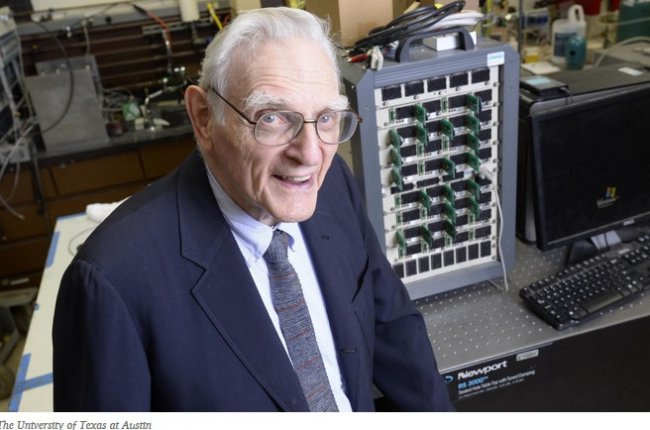 94-летний Джон Гуденаф, известный как один из создателей литий-ионного аккумулятора, возглавляет команду исследователей в Техасском университете в Остине. Группа разрабатывает твердотельную батарею, которая сможет хранить в три раза больше энергии, чем существующие литий-ионные батареи.