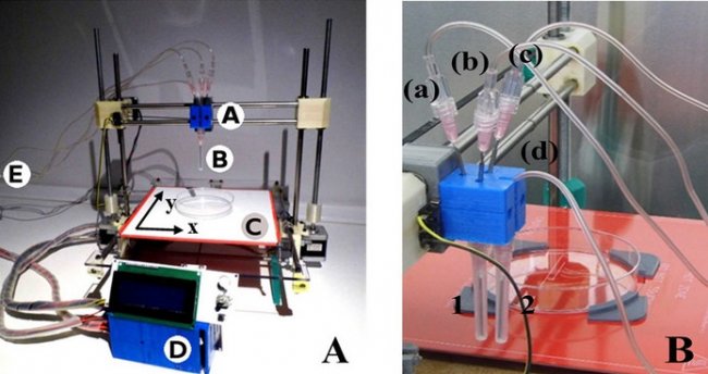 Биопринтер для печати человеческой кожи. В четырёх картриджах — плазма крови, фибробласты, хлорид кальция и кератиноциты. Печатью управляет контроллер Arduino (ATmega2560) с RAMPS 1.4 и ЖК-дисплеем. Принтер с двумя шаговыми электродвигателями работает на свободной прошивке Marlin, расчёт траекторий для нанесения слоёв выполняет программа Repetier 0.53. Для контроля объёма наносимой жидкости написан скрипт на C++.