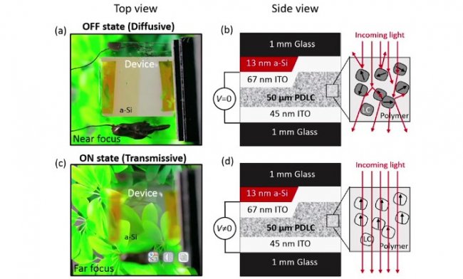 Исследователи создали новое смарт-окно из стекла, в основе которого лежит полимерная матрица, содержащая микрокапли жидкокристаллических материалов и слой аморфного кремния, который используется в обычных фотоэлектрических элементах. Когда окно «выключено», жидкие кристаллы рассеивают свет, делая стекло непрозрачным. При активации системы, слой кремния поглощает фотоны и обеспечивает необходимый для выравнивания кристаллов заряд, таким образом часть света свободно проходит через стекло и делает окно прозрачным. При этом вырабатывается энергия, которая питает само устройство, а ее излишки могут направляться на другие нужды, в числе которых дополнительное освещение и снабжение электричеством бытовых приборов.