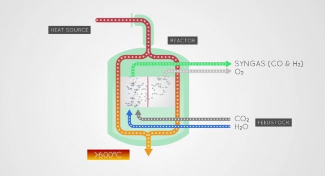 В реакторе с помощью высокой температуры и электричества происходит реакция одновременного расщепления диоксида углерода и воды, а на выходе получаются Syngas (CO + H2) и кислород (O2).