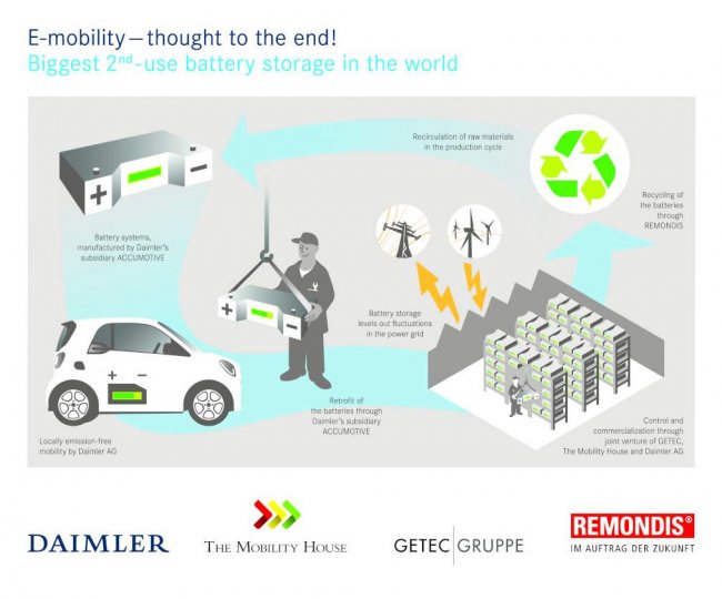 Инженеры немецкой автомобилестроительной компании Daimler совместно с The Mobility House, GETEC и REMONDIS предлагают эффективно использовать старые аккумуляторы автомобилей, но в несколько иной интерпретации.