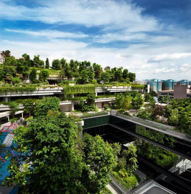 Концепция сооружения – вертикальный или висячий сад, только в данном случае высота вторична. За основу взяли старый жилой массив, состоящий из нескольких многоэтажных башен и перемычек между ними, после чего неиспользуемое внутреннее пространство площадью в 0,9 гектаров застроили многоступенчатой конструкцией. В ней три больших яруса, разделенных на отдельные этажи. В самом низу просторные залы для занятий спортом и танцами, посередине расположен медицинский центр, наверху – общественный парк под открытым небом.