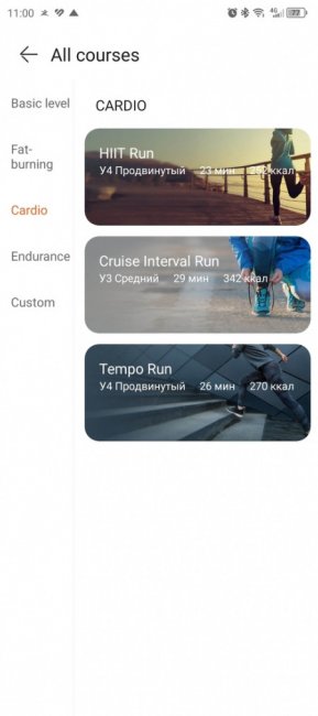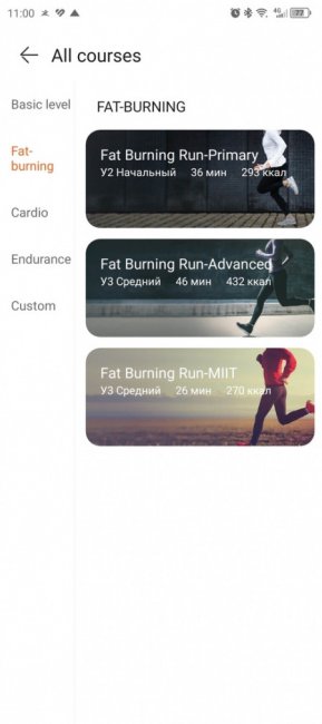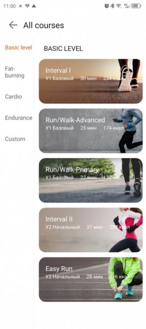 Раздел «Упражнение» призван помочь владельцу часов в беговых тренировках. Предусмотрено четыре различных программы, нацеленных на получение разных результатов. Это Базовый уровень для начинающих бегунов, Жиросжигающие пробежки, Кардиотренировки и Беговые упражнения на развитие выносливости. Пользователь может выбрать подходящую программу и просто следовать указаниям приложения. Также можно создать собственную программу тренировок с помощью искусственного интеллекта.