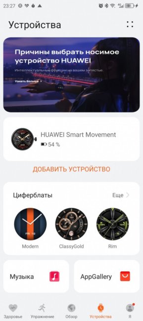 Раздел «Устройства» содержит информацию о самих часах и позволяет настроить различные элементы интерфейса. Причем здесь отображаются не только данные часы, но и каталог других носимых устройств Huawei с их кратким описанием. В соответствующем подразделе можно установить дополнительные приложения из экосистемы Huawei. В списке более 30 доступных приложений — перечень, по всей видимости, будет постепенно расширяться. Здесь есть приложения продуктивности, вроде календаря, программы тайм-менеджмента и планировщика задач, навигатор, компас, калькулятор, приложения для досуга, вроде медиаплеера, нескольких казуальных игр и головоломок. В подразделе настройки мониторинга показателей здоровья можно активировать функцию Huawei TruSleep для оценки качества сна и дыхания, функцию постоянного мониторинга пульса с предупреждением о слишком низком или слишком высоком его уровне, тест уровня стресса в состоянии покоя, функцию автоизмерения уровня кислорода в крови (она может быть особенно актуальна в высокогорных районах), а также включить уведомления о том, что вы сидите на одном месте больше одного часа.