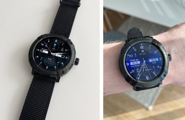 Часы имеют надежный корпус из стали 316L с алмазоподобным углеродным покрытием (DLC – Diamond-Like Carbon) и алюмосиликатное стекло. Корпус защищен от пота и коррозии, благодаря олеофобному покрытию, и выдерживает давление водяного столба до 5 атмосфер. AMOLED-дисплей имеет размер 4,66 см с разрешением 466 x 466 и плотностью пикселей 352 PPI. Экран поддерживает автоматическую регулировку яркости. Часы Smart Movement имеют впечатляющий встроенный динамик высокого качества, который позволяет слушать музыку прямо с устройства. В комплекте с часами поставляются два ремешка: гибкий силиконовый в городском стиле и нейлоновый в спортивном. Весят часы всего 72 грамма.