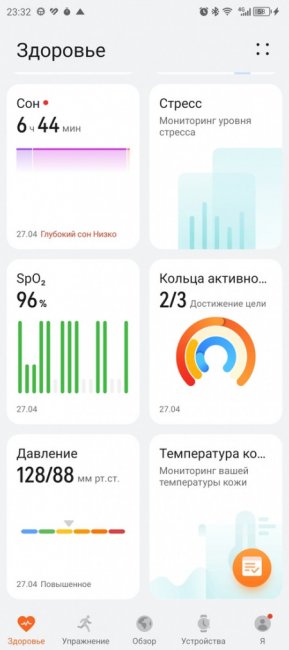 Это базовый функционал часов, чтобы получить доступ к расширенным возможностям мониторинга здоровья, надо отсканировать специальный QR-код и скачать приложение Huawei Health. Для отслеживания различных физиологических показателей носителя используются восемь кольцеообразных и два центральных сенсора. Конкретный перечень анализируемых параметров можно настроить в приложении.